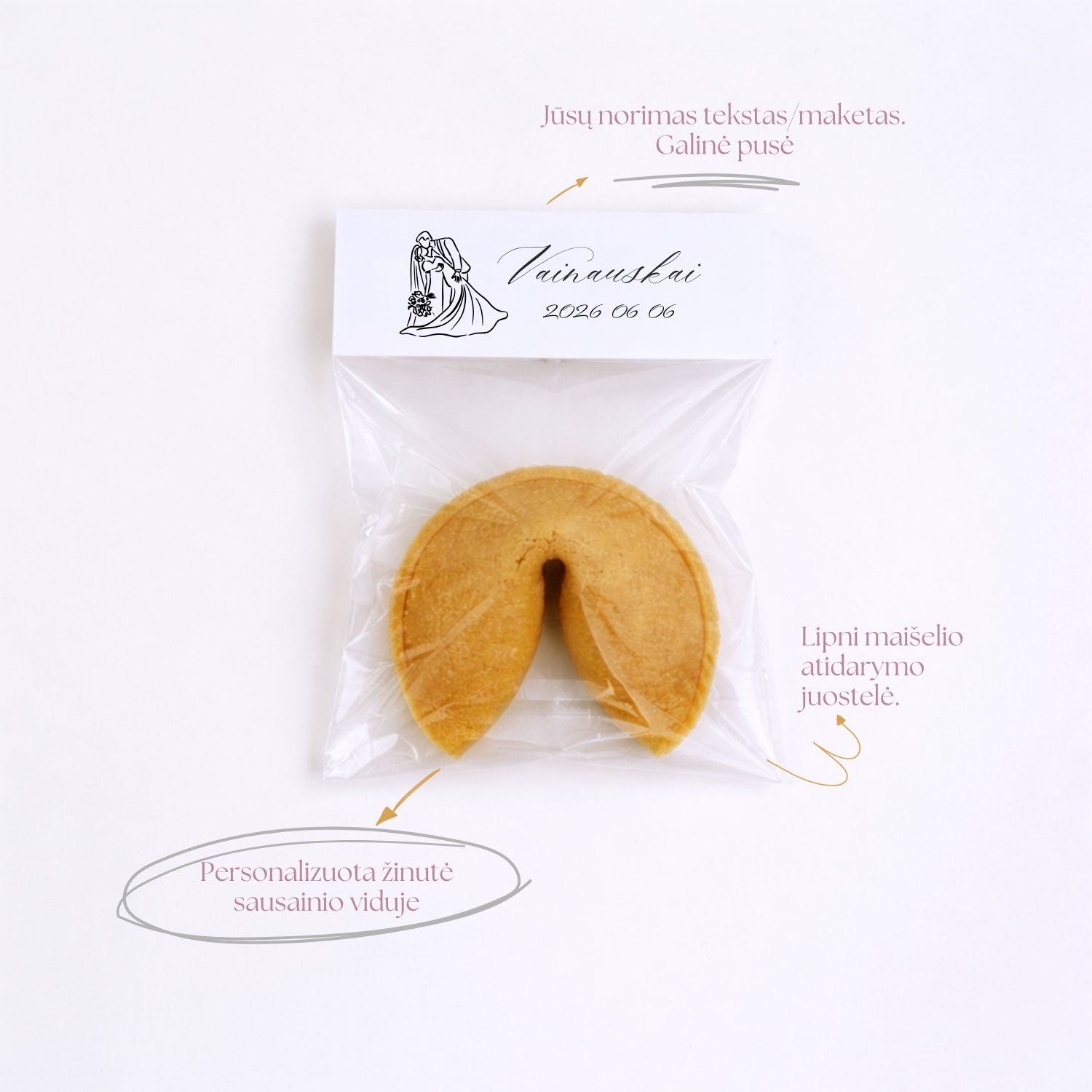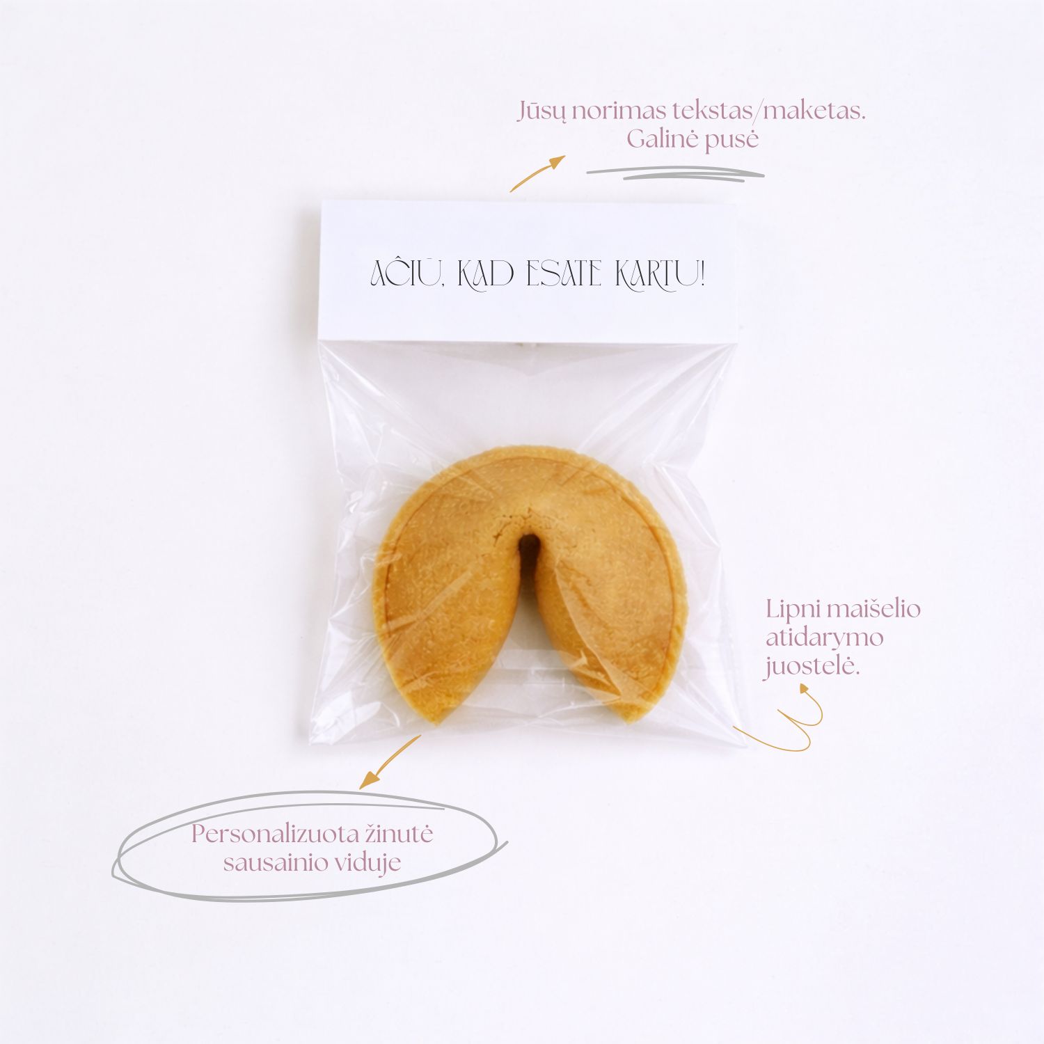Esant poreikiui sausainius pagal žinutes galime atskirti ir supakuoti atskirai dėžėse. Dėžučių viduje rasite pridėtą lapelį su tekstu, kad žinotumėte koks tekstas yra sausainio viduje. Papildomas pakavimas priklauso nuo užsakomo kiekio. DERINAMA IŠ ANKSTO.