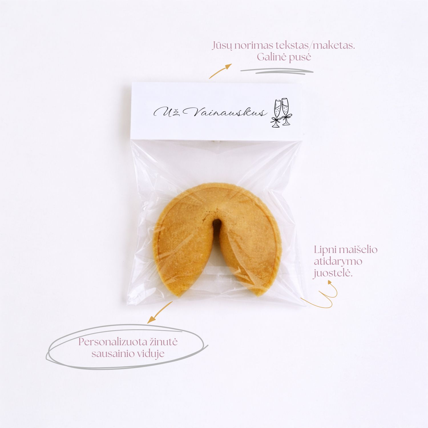 Kokį tekstą dėti į sausainio vidų sprendžiate jūs. Galite naudoti savo tekstus arba jei trūkstą idėjų daug tekstų rasite puslapyje. Žvilgterk šiek tiek aukščiau ir pamatysi skiltį – Tekstai į sausainio vidų.