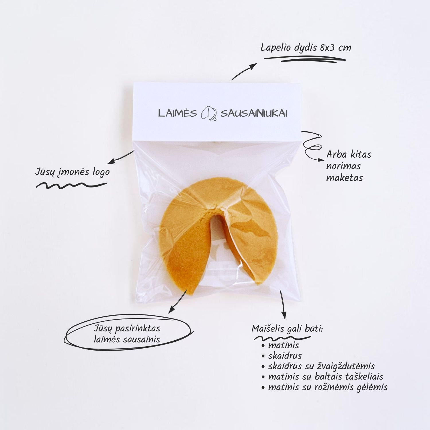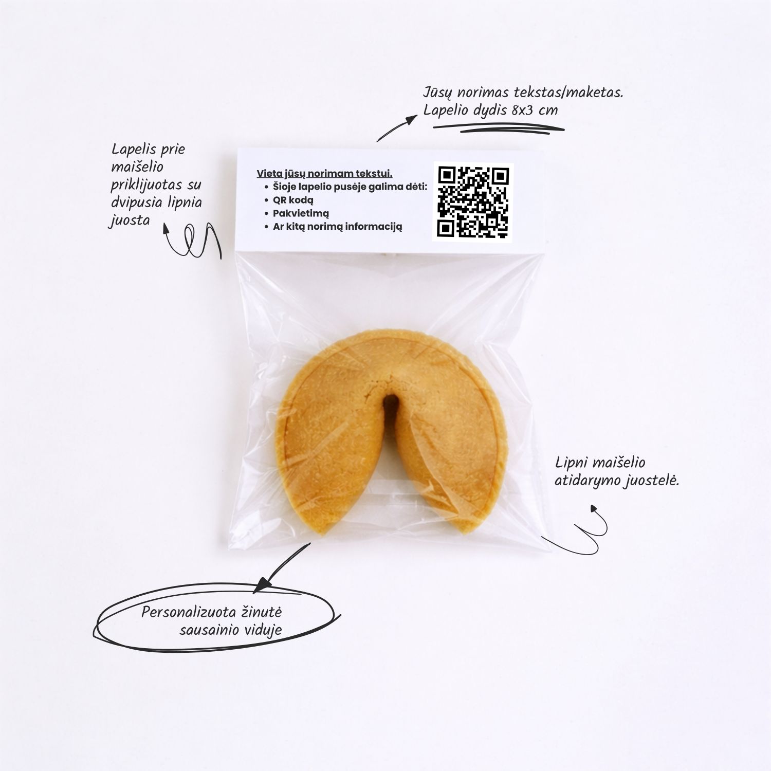 Esant poreikiui sausainius pagal žinutes galime atskirti ir supakuoti atskirai dėžėse. Dėžučių viduje rasite pridėtą lapelį su tekstu, kad žinotumėte koks tekstas yra sausainio viduje. Papildomas pakavimas priklauso nuo užsakomo kiekio. DERINAMA IŠ ANKSTO.